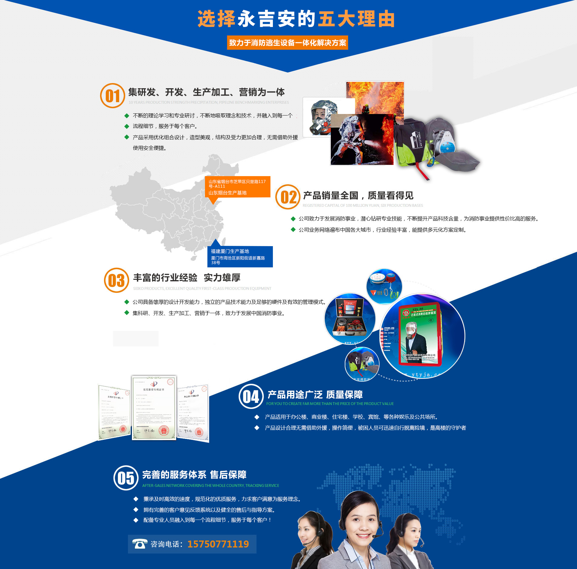 永吉安(廈門(mén))消防科技有限公司,成立于2014年,坐落于中國(guó)南方風(fēng)的“海上花園”—廈門(mén)。我們是一家集消防逃生設(shè)備的研發(fā),生產(chǎn),銷(xiāo)售于一體的專(zhuān)業(yè)化公司,公司的創(chuàng)立伊始,始終堅(jiān)持以“為人類(lèi)安全保駕護(hù)航”為使命,貫徹“拼搏”,“進(jìn)取”“發(fā)展”“責(zé)任”的經(jīng)營(yíng)理念,把“堅(jiān)持產(chǎn)品開(kāi)發(fā)戰(zhàn)略,以豐富的產(chǎn)品線(xiàn)迎接多樣化的未來(lái)需求”當(dāng)作戰(zhàn)略目標(biāo),力圖成為消防產(chǎn)品一線(xiàn)品牌,我們以專(zhuān)業(yè)的生產(chǎn)技術(shù),為廣大客戶(hù)提供周到的服務(wù),也希望與此同時(shí)能用這樣的方式為城市的消防安全,為國(guó)家貢獻(xiàn)出自己一份微不足道的力量。公司發(fā)展迅速,業(yè)務(wù)發(fā)展至中國(guó)南北方多個(gè)城市,收貨了一批忠實(shí)的穩(wěn)定的客戶(hù)群體,也在消防行業(yè)中擁有了一定的口碑。 自成立以來(lái),我們不斷的進(jìn)取先后獲取得了國(guó)家CCC質(zhì)量管理體系認(rèn)證以及國(guó)家專(zhuān)利證書(shū),多年來(lái),仰賴(lài)國(guó)家政策扶持和社會(huì)各界的認(rèn)可,公司發(fā)展迅速,業(yè)務(wù)發(fā)展至中國(guó)南北方多個(gè)城市,收獲了一批忠實(shí)的穩(wěn)定的客戶(hù)群體,也在消防行...